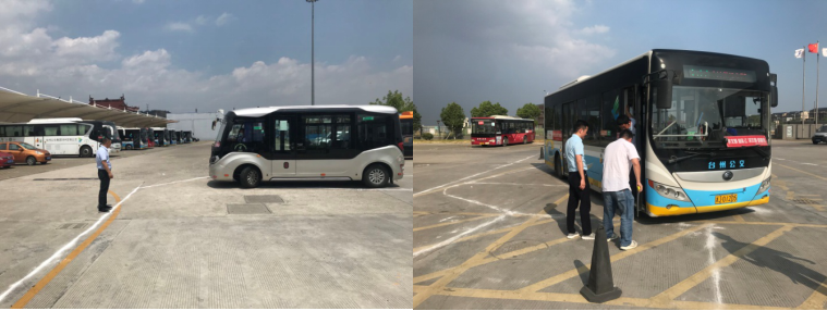 為準(zhǔn)確復(fù)核、驗證設(shè)計單位提供的公交車位尺寸及所在區(qū)域的行車道寬、行車路徑、轉(zhuǎn)彎半徑等技術(shù)指標(biāo)的合理性與可操作性,8月26日,臺州公交集團(tuán)又聯(lián)合綠管集團(tuán),赴巴士公司停車場進(jìn)行實地打點(diǎn)放樣,將圖紙所示車位、轉(zhuǎn)彎弧度、建(構(gòu))筑物等按1:1比例還原在測試場地上,并請駕駛?cè)藛T駕駛同尺寸車輛進(jìn)行實地模擬行駛,檢驗設(shè)計車位排布的合理性及與邊線建筑物的允許安全距離,通過多輪分析模擬結(jié)果和聽取駕駛?cè)藛T的建議,不斷校正、調(diào)試、測量、記錄,并第一時間將模擬結(jié)果反饋給方案設(shè)計單位,為下一步設(shè)計圖紙優(yōu)化提供有效支撐,確保項目落地后既能降低駕駛?cè)藛T操作難度,又能使乘客無障礙快速上下車,力爭做到人車分離、“一步到位”。