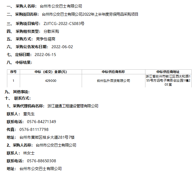 浙江建通工程建設管理有限公司關于臺州市公交巴士有限公司2022年上半年度勞保用品采購項目(非政府采購項目)的結(jié)果公告