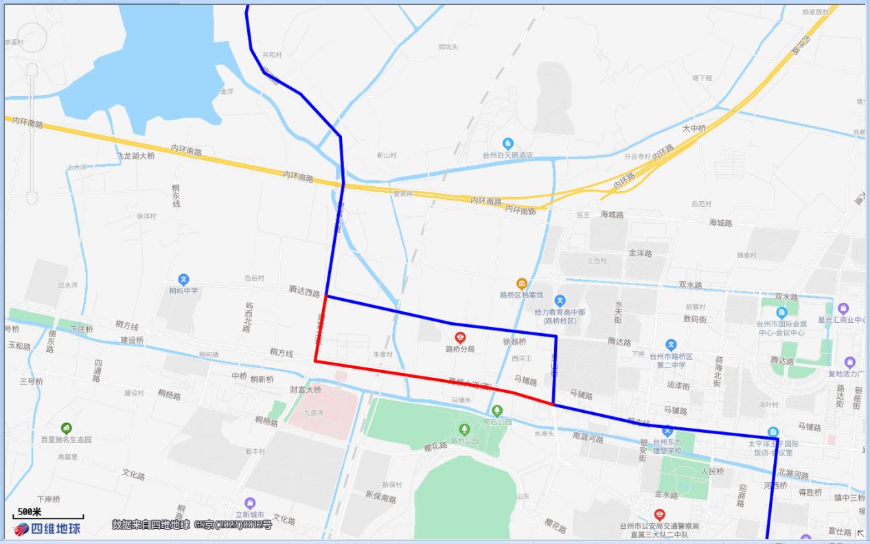三、307路,恩澤醫(yī)院與水天一色間,臨時調(diào)整為經(jīng)路橋大道、靈山街運行。臨時取消財富大道騰達路口、高橋章、路橋圖書館、路北街道4對站點。同時,臨時增加路橋電力大廈、園丁苑等2對站點,恩澤醫(yī)院往水天一色方向增設恩澤醫(yī)院北1個單向站點。