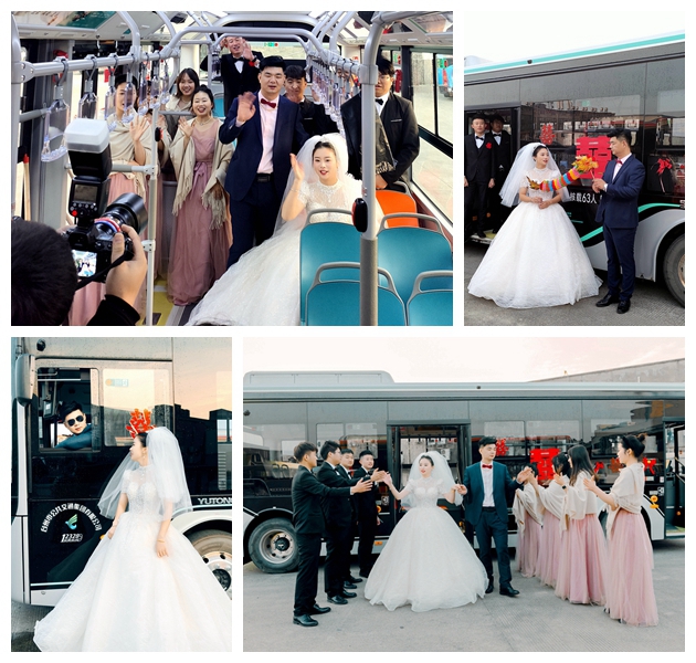 大紅“囍”字和緞帶,貼在363路公交車上,這對新人身著禮服,在眾人的祝福聲中喜結(jié)連理。對他們而言,是臺州公交這個“紅娘”,牽起了彼此的緣分,在這里,他們從相識到相知,從相知到相戀,終于共同走進(jìn)了婚姻的殿堂。這個特殊的日子里,他們以公交車為背景,拍攝了婚禮MV和婚紗照,用來紀(jì)念這段因公交而走到一起的情緣。