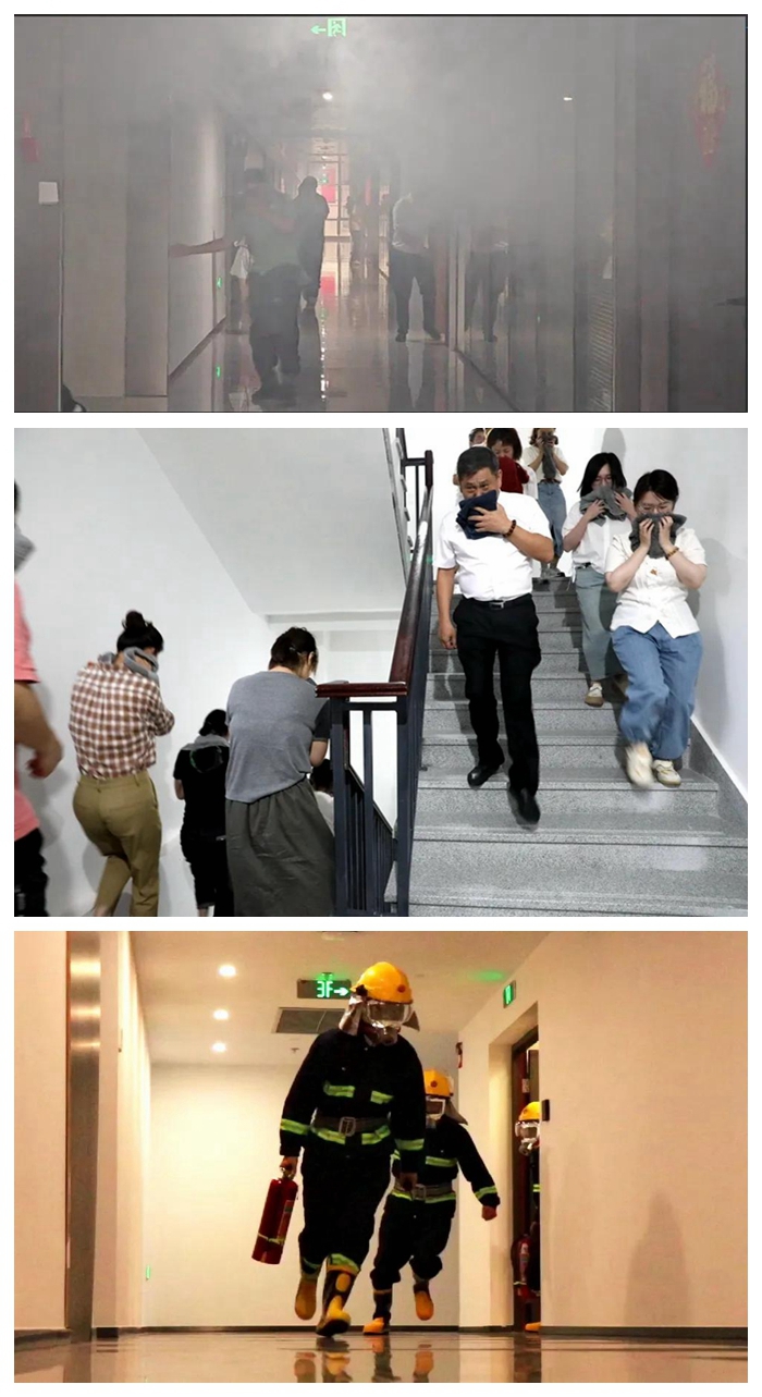 此次演練設(shè)定大廈六樓會(huì)議室因電器短路發(fā)生火災(zāi),火勢(shì)蔓延迅速,巡邏人員現(xiàn)場(chǎng)查看火情后第一時(shí)間向消控室報(bào)告,并啟動(dòng)火災(zāi)事故應(yīng)急預(yù)案。按照預(yù)案分工,現(xiàn)場(chǎng)救援組、后勤保障組、人員疏散組、秩序維護(hù)組迅速集結(jié),根據(jù)各自職責(zé)開展疏散、滅火、救援。經(jīng)過各職能小組的密切配合,奮力救援,火勢(shì)被撲滅,所有人員全部轉(zhuǎn)移至安全地帶。