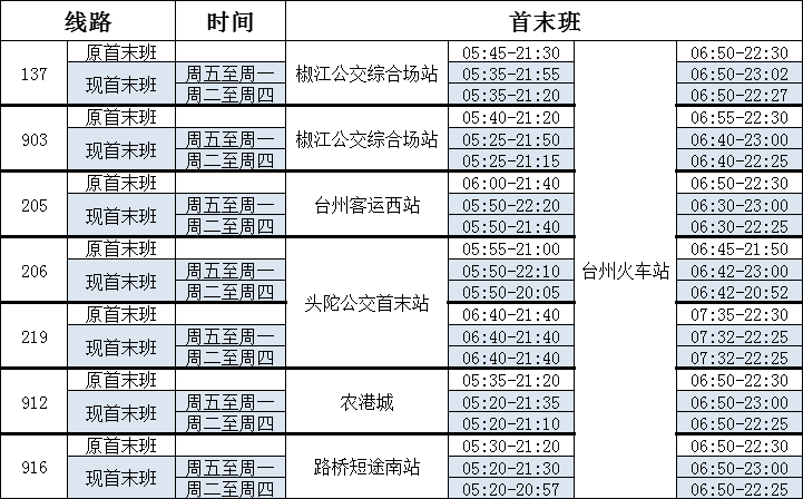 2019年7月10日開始,臺州火車站動車、高鐵班次運營時間進行調整,為達到無縫對接換乘,臺州公交對相應的線路在首末班上作同步調整。請廣大市民相互轉告,提前前往相應站點進行候車。