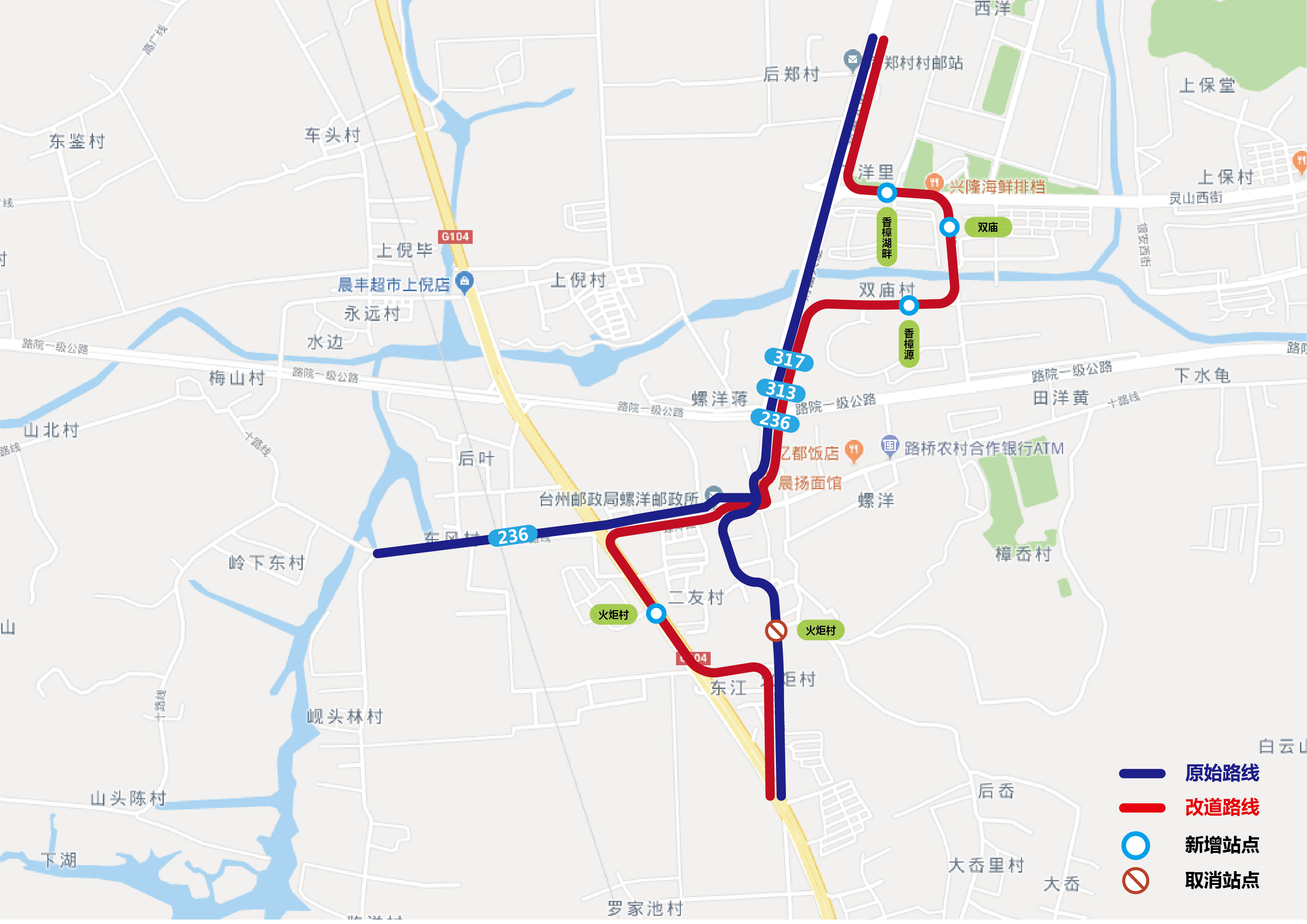 236路、313路、317路:其中236路上行(往恩澤醫(yī)院方向)、313路下行(往數(shù)碼城方向)與317路上行(往恩澤醫(yī)院方向)取消財富大道至靈山西街路段,改由財富大道經(jīng)雙廟路、靈山西街至財富大道,增設(shè)香樟源、雙廟、香樟湖畔三個站點(diǎn)停靠,236下行(往院橋方向)、313路上行(往螺洋方向)與317路下行(往中岙里村方向)按原線路運(yùn)行。