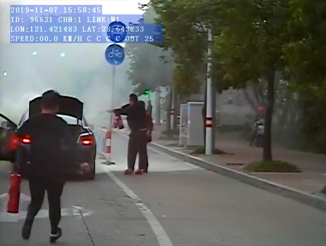 11月7日下午15點57分,W1路劉瑞嘉師傅駕駛公交車到臺州體育場路與東環(huán)大道交叉路口附近,突然注意到前方一輛黑色私家車的車頭部位濃煙滾滾,情況十分危機。一名疑似車主的男子正在向過往車輛求救,但都沒有車輛停下。